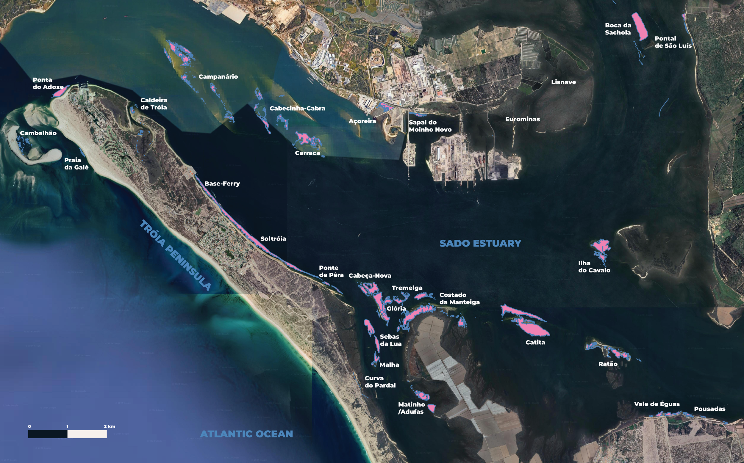 This is the mapping of the seagrass meadows in the Sado estuary carried out by Ocean Alive since 2019. In total, we have identified about 31 meadows and mapped 29.
