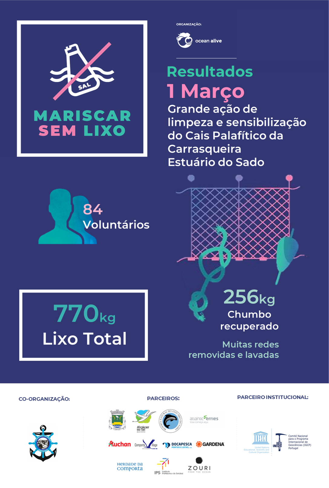 A Campanha de Sensibilização e Limpeza das margens do estuário do Sado Mariscar SEM Lixo tem três eixos: ações de sensibilização direta aos mariscadores realizadas por uma rede de Guardiãs do Mar, mulheres da comunidade piscatória que foram capacitadas como agentes de sensibilização; ações mensais de limpeza do estuário com voluntários; e uma rede de agentes locais para implementar soluções que evitam o plástico no oceano (através da sensibilização, da valorização do plástico e de outros resíduos recicláveis e da colocação de contentores nos locais de mariscagem).